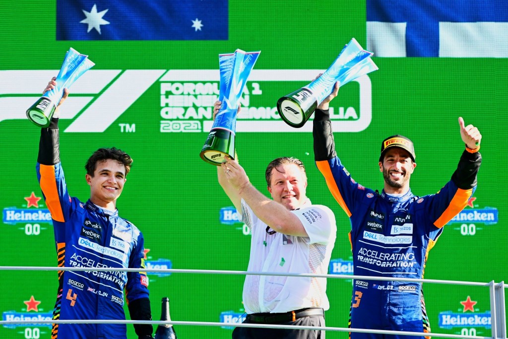 McLaren CEO Zak Brown, representing the team on the podium, alongside Daniel and Lando: