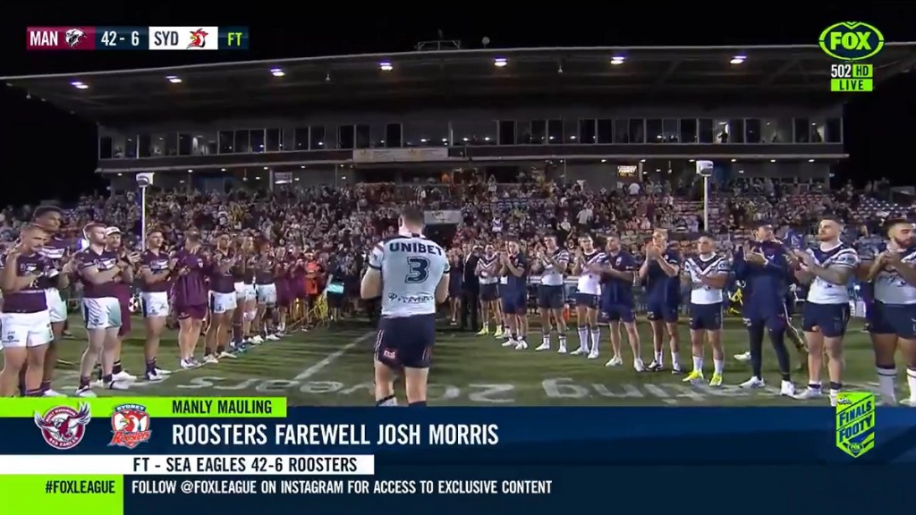 Absolutely no surprises with the outcome of the game, as the Sea Eagles looked like a team that was absolutely overjoyed at not having to play the Storm, and the Roosters looked like a team that had played their Grand Final the week before, and it showed in the opening minutes when the Chooks put a kickoff out on the full, gave away a few penalties, 7 tackle sets, pissweak defence that would’ve had Trent Robinson vomiting in the box, and the end result was Manly ensured Easts never had a realistic chance of winning, going up 18-0 by the 20 minute mark, and by the time the final bell rang, Tommy Turbo, Jason Saab, DCE and friends had brought about a brutal end to Josh Morris’ playing career.