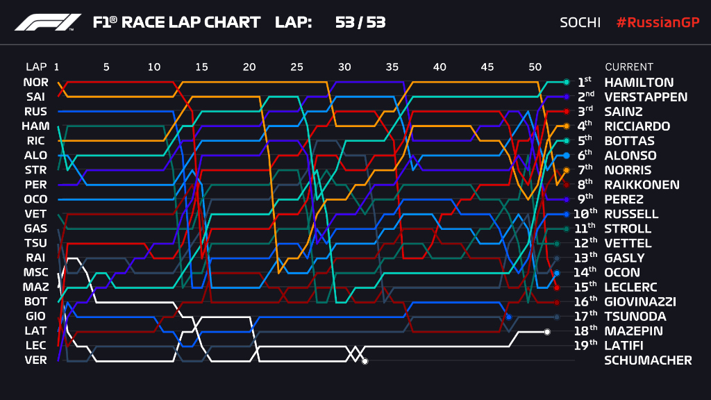 Before we finish, here’s the lap chart…. everything from Lap 45 onwards looks like the heart rate of every Formula 1 fan during the closing laps: