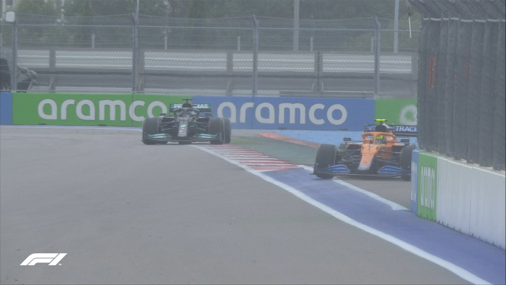 As he had done most of the afternoon from his maiden pole position, McLaren’s Lando Norris led the Russian Grand Prix by just over a second from Lewis Hamilton, with Norris on course for his maiden Grand Prix victory, and Hamilton pursuing his milestone 100th win.