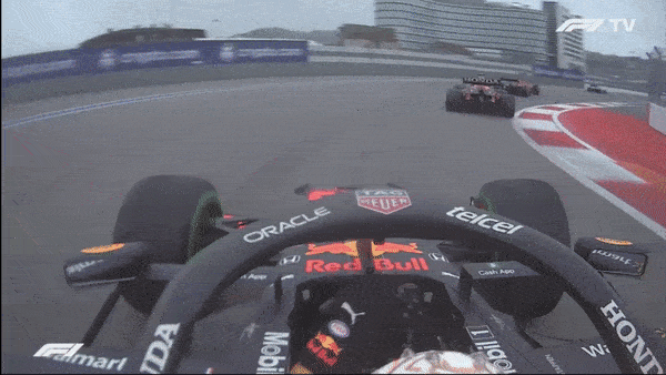 But, as forecast, the rain had finally arrived in Sochi and parts of the track were becoming slippery, right as Sergio Perez passed Carlos Sainz for 3rd down the back straight, Fernando Alonso had just passed Daniel Ricciardo for 5th, and Max Verstappen, after starting 20th due to taking on a fresh engine, had made up huge ground to 7th on Medium tyres that were nearing the end of their life, Charles LeClerc was 8th in the sister Ferrari, and the Aston Martins of Lance Stroll and Sebastian Vettel were 9th and 10th.
