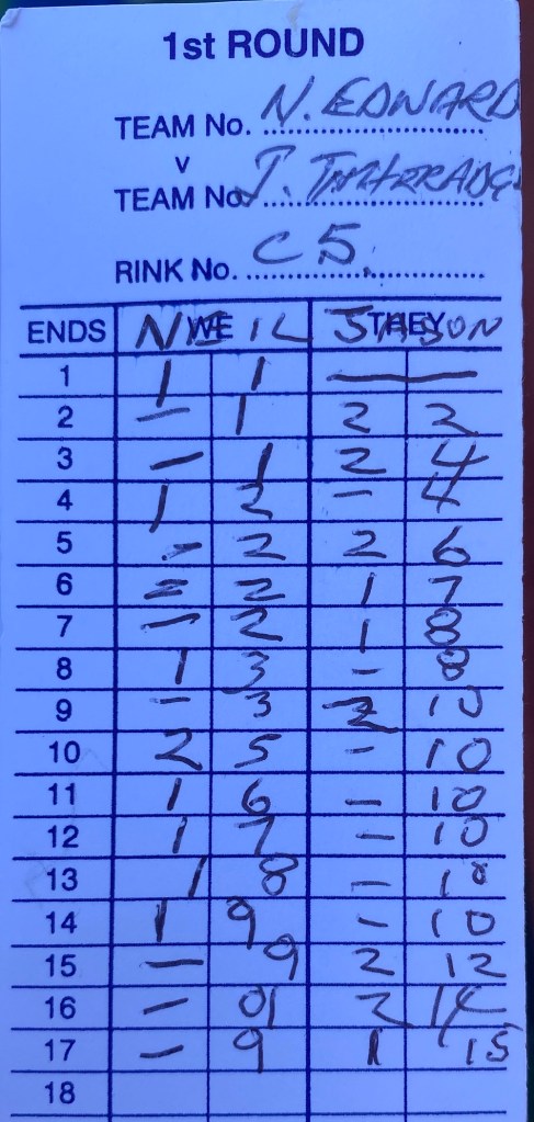 So the story was there were 8 groups of 3, the format for the group stage was ’15 Up’ (Aka first to 15), and I was playing 3rd Division lead Neil, the Irishman from Ireland, and I was 10-5 up after 10 ends when we were forced to run for cover, and at the resumption Neil rattled off 4 consecutive ends and had me under the pump, then I somehow landed consecutive holds of 2, and got the 15th shot at the first time of asking.