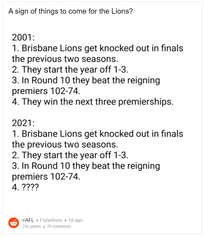 There were at least 3 coincidences from the 2001 and 2021 Brisbane Lions, and one of them did not involve a premiership
