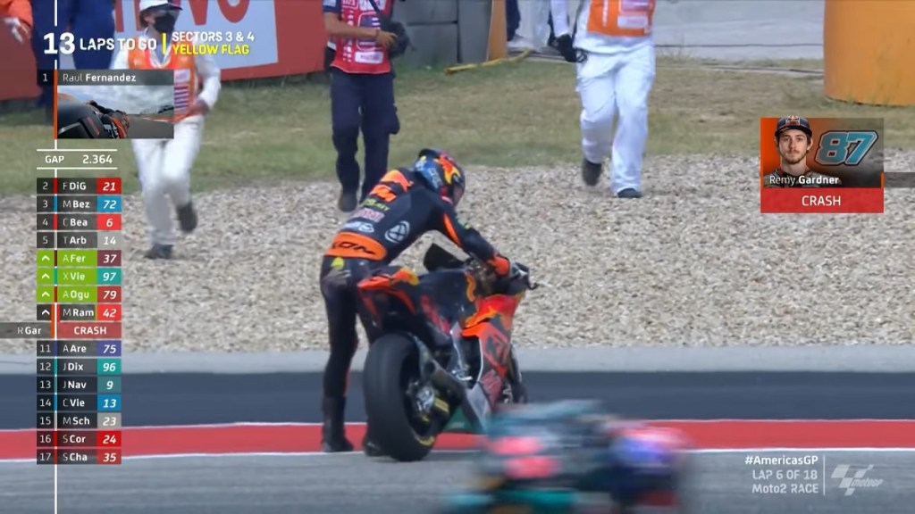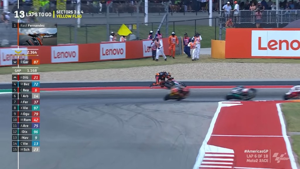 On Lap 2, Martin passed Bagania for 4th, then Nakagami tried a move for 5th at Turn 11 that didn’t stick, and once the riders crossed the back straight down to Turn 12, Nakagami lost the front and fell out of contention!