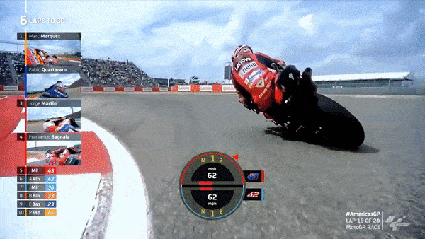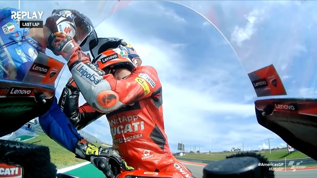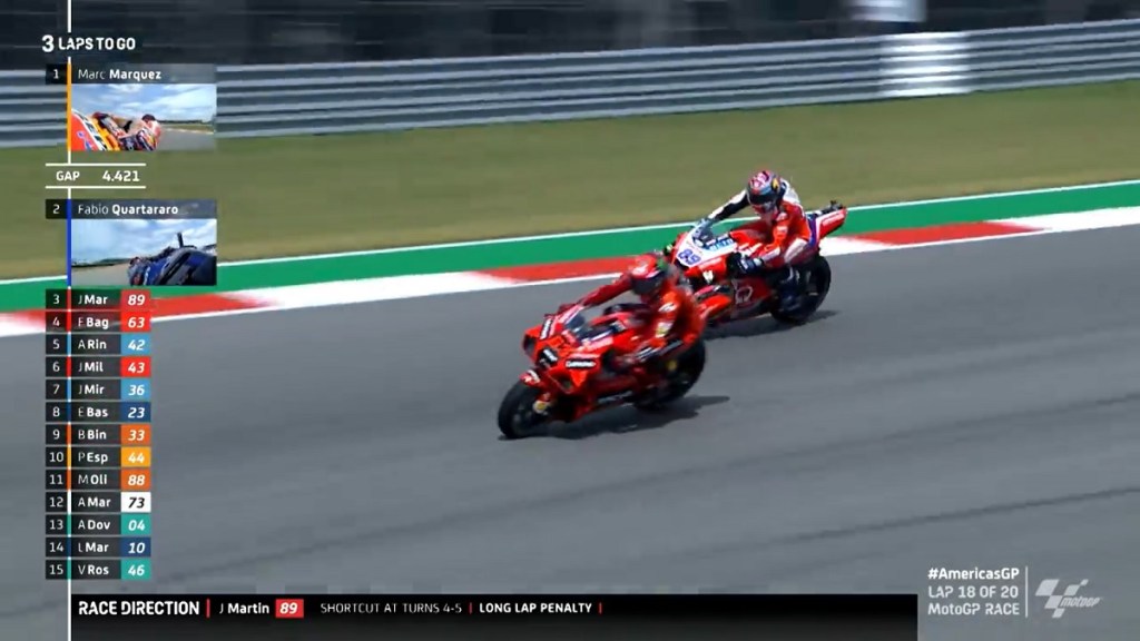 On Lap 17, Martin showed cracks big enough that Tony Greig would’ve stuck his keys in them, because he became perilously unsettled after hitting the kerb at Turn 4, resulting in him shortcutting Turn 5, and Bagnaia had cut the gap down to just 2 tenths by the end of the lap, and it looked like the rookie Martin, who still isn’t 100% fit after that horror crash at Portimao, was physically knackered after 17 laps on the Austin motocross track.