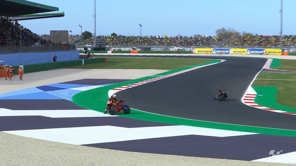 The answer according to Oliveira himself is that feel of the forks changed as the fuel load lightened, causing him to lose the front of his KTM over the bumps of the Turn 14 hairpin, almost at the exact same time that Bagnaia went off at Turn 15: