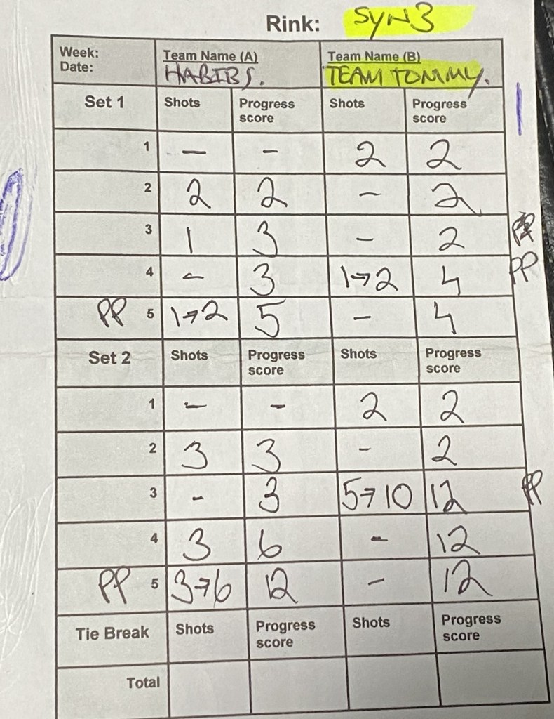 Looking at the other results, the match of the night was undoubtedly the Habibs against Team Tommy on Synthetic 3, with the Habibs winning the 1st Set 5-4 after using their powerplay on the final end to turn 1 shot into 2, then in the 2nd Set, Team Tommy held an almighty 5 turned into 10 on their 3rd End powerplay to rocket out to a 12-3 lead (I can confirm Steve Withers didn’t play on that end), but the Habibs held 3 on the 4th End to cut it to 12-6, then Johnny’s team used the Powerplay on the final end once again, and turned 3 into 6 to draw the set 12-12, bringing a dramatic ending to the high scoring epic.