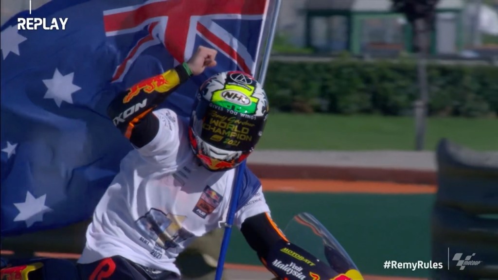I’ll be honest, I don’t want to relive the Moto2 race, because good lord I nearly had a heart attack watching it, but as you all know, with a 23-point lead after winning in Portimao, the equation was simple for Remy Gardner – If his brilliant teammate Raul Fernandez won the race, then Remy needed to finish no worse than 13th (14th would mean Fernandez won on a countback) to become the first Australian to win a World Championship since Casey Stoner’s second MotoGP title in 2011, and the first Aussie to win the Intermediate class title since Kel Carruthers won the 1969 250cc title on a Benelli, which would make Remy and Wayne Gardner (1987 500cc) only the second father-son motorcycle World Champions, joining King Kenny Roberts (1978-80 500cc) & Kenny Roberts Jnr (2000 500cc) in the annals of history.