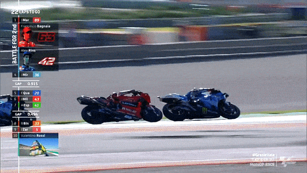 On Lap 6, Rins made a pass on Bagnaia at the same spot he passed Mir, but Bagnaia stuck with him on the run through Turn 7 down to 8, and held on to 2nd place: