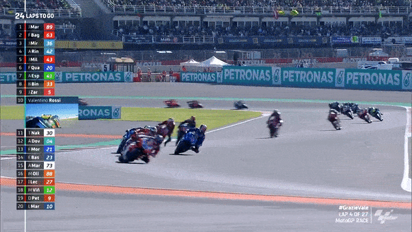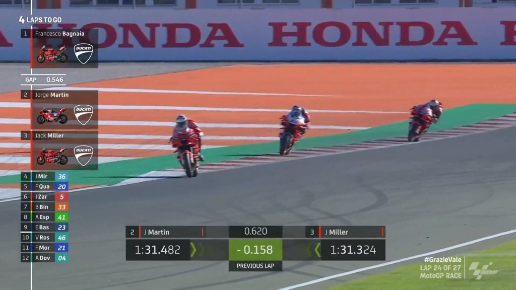 With 4 laps to go and the entire town of Bologna about to die of happiness at what they were seeing, Bagnaia seemed to have things under control with a half-second lead, Miller was now within 6-tenths of Martin, while Quartararo now had a realistic chance of taking 4th from Mir, cutting the deficit down from 1.4 seconds to 6 tenths in the space of 4 laps.