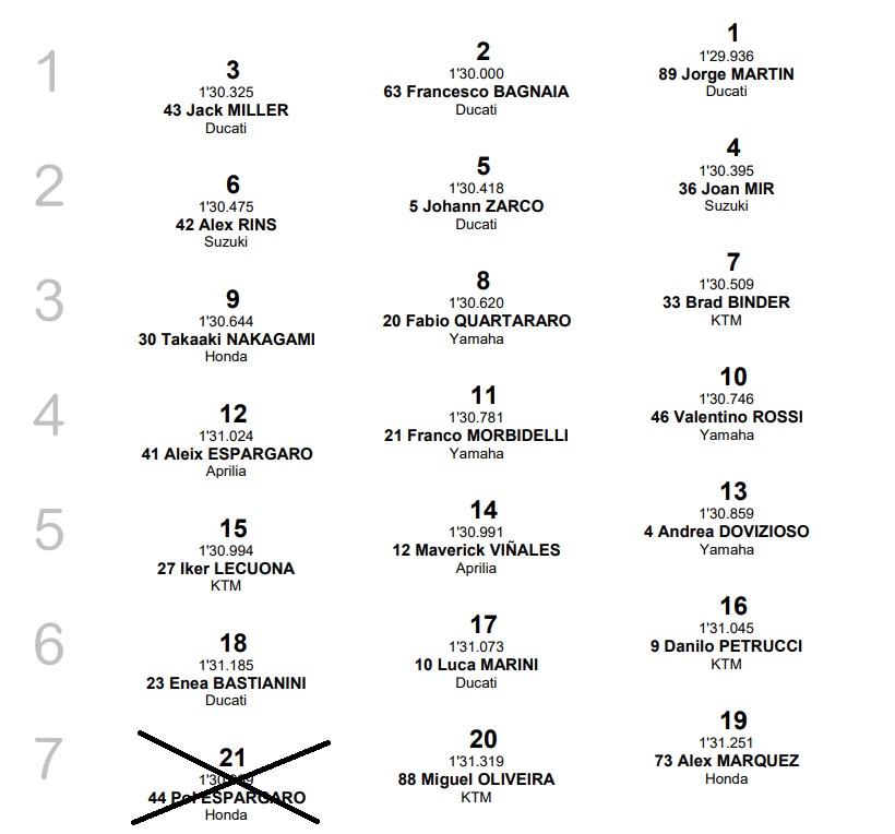Outgoing World Champion Joan Mir started 4th for Suzuki, just ahead of Zarco, with Alex Rins coming from Q1 to start 6th, Brad Binder was the only KTM rider to escape Q1 and start 7th, World Champion Fabio Quartararo was 8th, Takaaki Nakagami was the only Honda in Q2, Valentino Rossi pleased just about everyone by making it directly into Q2 and starting 10th for his last hurrah, ahead of his protégé Franco Morbidelli, with Aleix Espargaro the slowest in Q2.