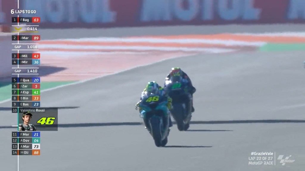 A few laps later, Martin still hadn’t fallen away, cutting the gap back to 2-tenths, with Miller just over a second behind the Spaniard after setting his own personal best with 6 laps to go, Mir was starting to fall into the clutches of Quartararo, Zarco was up to 6th after passing Espargaro, who was starting to really fade away late in the race, and Rossi was still in 10th, and somewhat fittingly/ironically/whatever you want, it seemed Vale’s career would end with Franco Morbidelli, the first rider he ever signed to the VR46 Rider Academy, directly behind him in 11th.