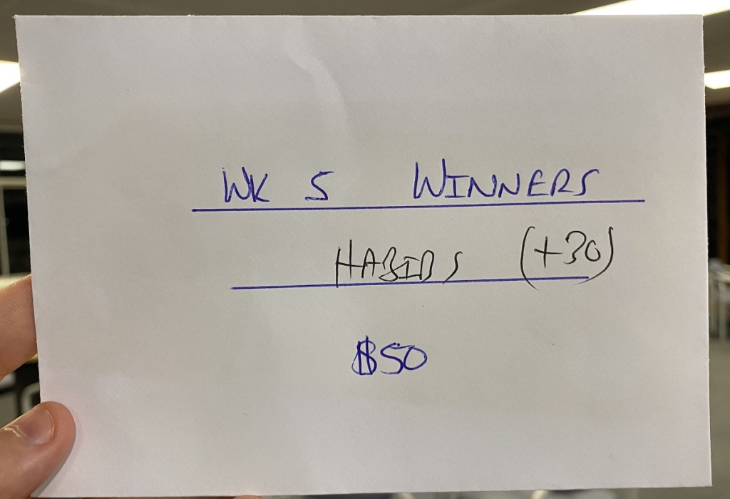 I’m sure young Alex will sleep well when he reads this and finds out the Wesley crew could’ve finished 7th… Instead, they finished Week 5 in Richmond’s former coveted position of 9th.