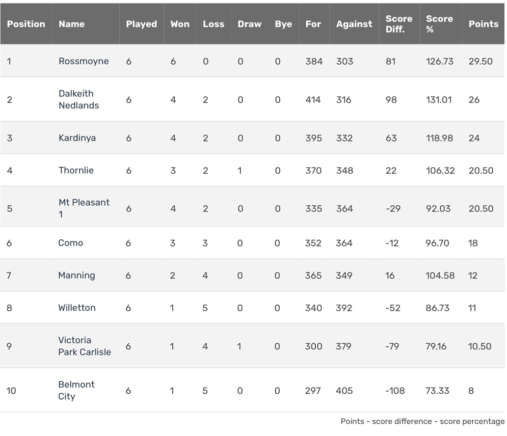 The other amazing part of that Thursday was 2nd placed Dalkeith-Nedlands also lost (5-1 At Thornlie) on Thursday, so Rossmoyne stayed on top, with Kardinya now half a point behind….
