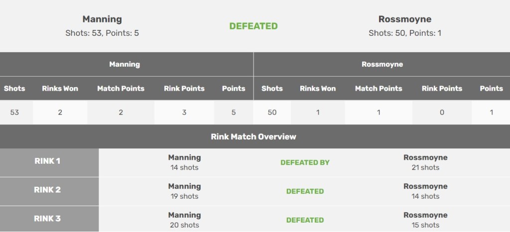 Because on the final rink, the Manning team led by Justin dominated most of the day and led 19-11 with an end to play, giving ‘us’ a 6-shot lead in the aggregate, and having lost that huge cushion on the middle rink, Rossmoyne, needing 6 shots to tie, could only hold 3 on the final end, and thus, the upset was complete by a very narrow margin.