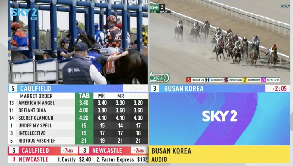 As it turned out, that was just the start of the day, because a world-first occurred when Race 5 at Caulfield took so long to load that Sky Racing did the unthinkable and sent The Heath meeting to Sky 2 (In favour of Newcastle running 2 minutes late), where it was then split-screened with the Korean races in Busan: