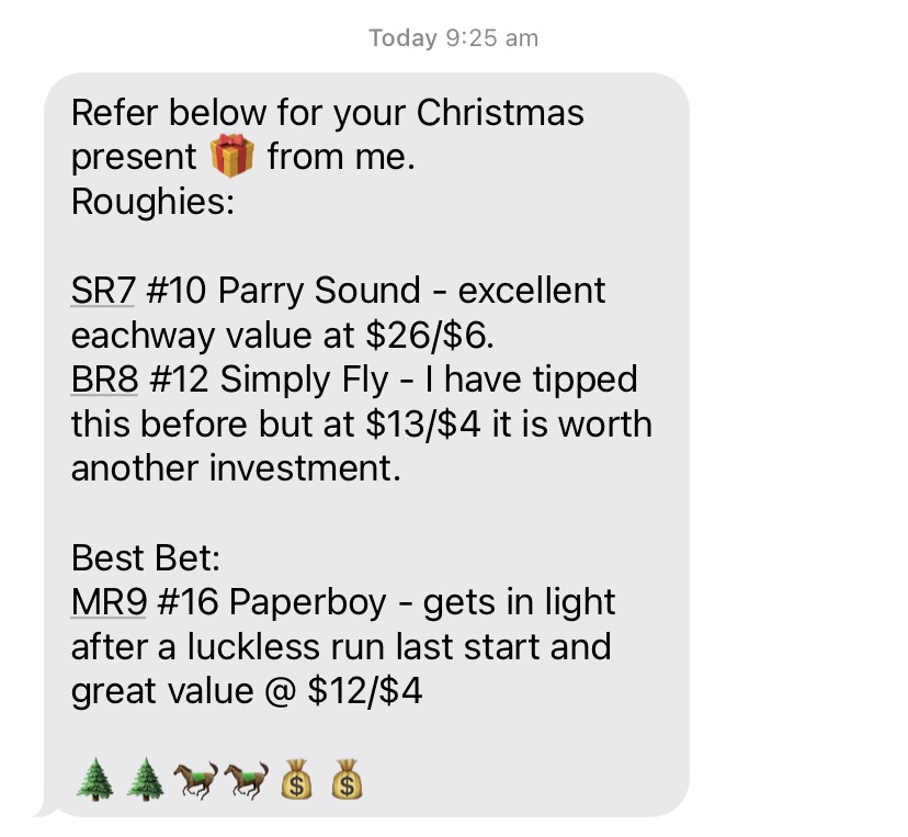 Funny story about Parry Sound, my good mate Half Price sent me his usual Saturday/Sunday tips this morning, but somewhere along the line I was too engrossed with watching Pat Cummins bowl, and managed to miss the fact that Pricey had plucked out another massive bit of value: