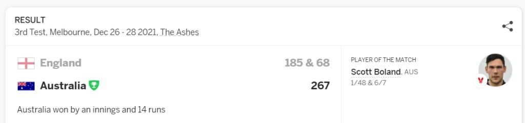 Part 4: The Ashes remain in Australia as England lose the Boxing Day Test by an innings inside 2.5 days, getting bowled out for 68 in their 2nd Innings, their worst Test score in Australia since 1904, as some random tubby Victorian named Scott Boland, on debut, turns into the second coming of Merv Hughes and takes 6 wickets for 7 runs in just 4 overs in the 2nd Innings.