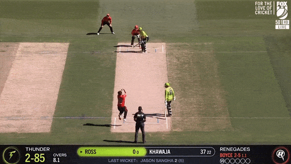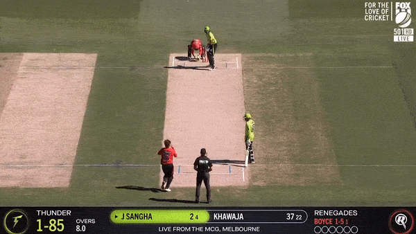 - After getting the Sydney Thunder off to a lightning start (Pardon the pun), Alex Hales holed out on 44 to end Boyce’s first over, caught by Unmukt Chand in the deep: