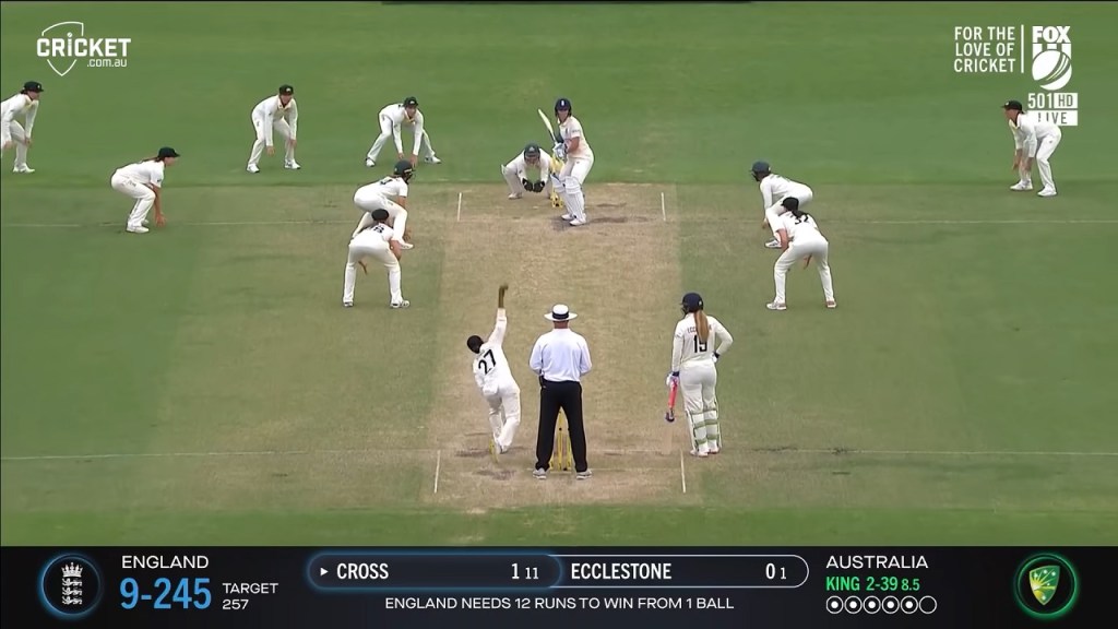 And the last ball of the Women’s Ashes Test in Canberra, as England went from having a huge shot at an almighty Test victory against Australia in Australia, only for Australia’s fielding to leave them facing this familiar scene: