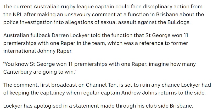 And the punchline in a Darren Lockyer joke about the Canterbury Bulldogs, during the sex scandal of 2004: