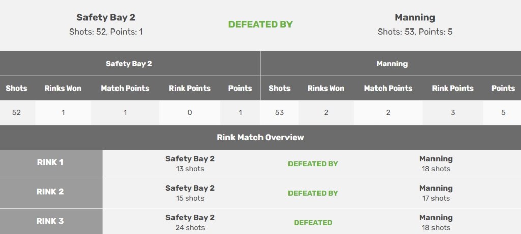 Bob managed to get his first bowl into 3rd shot about a foot short of the jack, which seemingly put enough pressure on John to ensure he couldn’t get his final bowl close enough to get that third shot, and despite the fact that Bob could quite easily have had a crack at taking the hold with his second bowl, Ric pointed out that we had the aggregate by a shot, so he put the bowl down, and that was game set and match, as we won the rink 18-13, and the mighty Manning Eagles knocked off the ladder leaders 53-52 on the road.