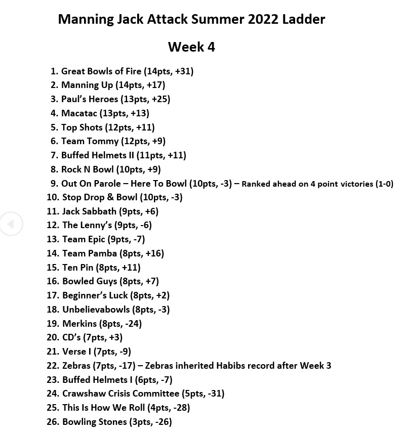 So that meant 4th and the $10 went to the Great Bowls, who comfortably defeated the Merkins on Grass Rink 4 after Nelle’s back got sore from carrying the team, and that was the full stop on a great night for the Great Bowls, given Jonesy won the Grass Corner to Corner, and with results going their way, the Great Bowls are now on TOP of the ladder with just one game to go before the finals, and if you remember last year, the Great Bowls won the Summer Jack Attack title, so we’ll see if history does indeed repeat, contrary to the claims of Split Enz.