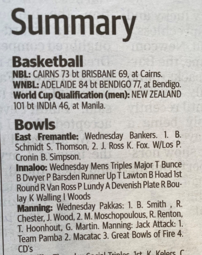 Thanks to Sue Hogg, last week’s results made their way into the Sports Results section of Friday’s West Australian, although it is The West, so we were surrounded by 400 stories about West Coast’s injury crisis: