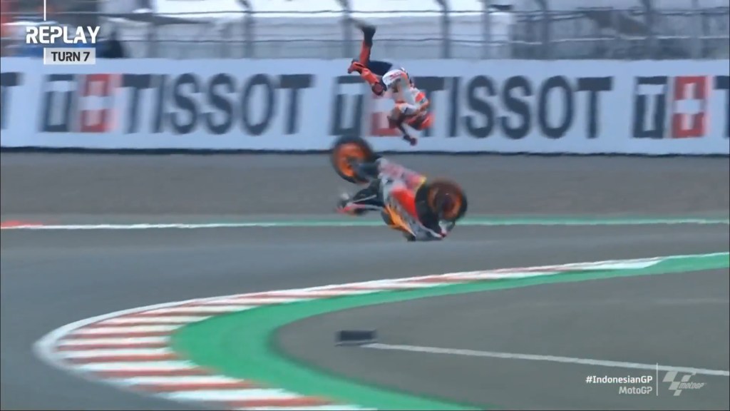 It should be noted both of those accidents were before Marc injured his right shoulder and suffered a seriously broken right arm & subsequent nerve damage at Jerez in July 2020, which means he’s particularly vulnerable in right hand corners and clockwise tracks, due to the stress loading on his body – Turn 7 at Mandalika being such an example.