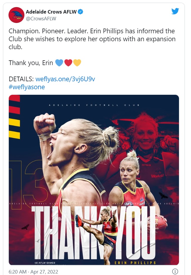 Yes, some imaginary Crows fans with heavy French accents are clearly upset at today’s news, not so much that Erin left, because everyone knew she was leaving after the Grand Final win, but more the fact that she left for the Crows’ eternal rivals…