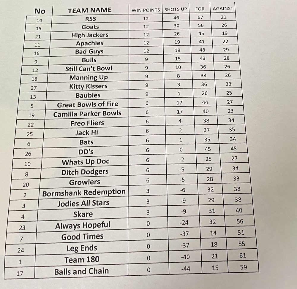 So that 6-19 defeat meant Team 180 would finish the day winless on -40 shots, but in a hilarious case of the Manning teams helping each other out, the Great Bowls’ 16-1 win against Balls and Chain meant the B&C finished on -44 shots, meaning they would finish with the wooden spoon, and Team 180 finished 26th!