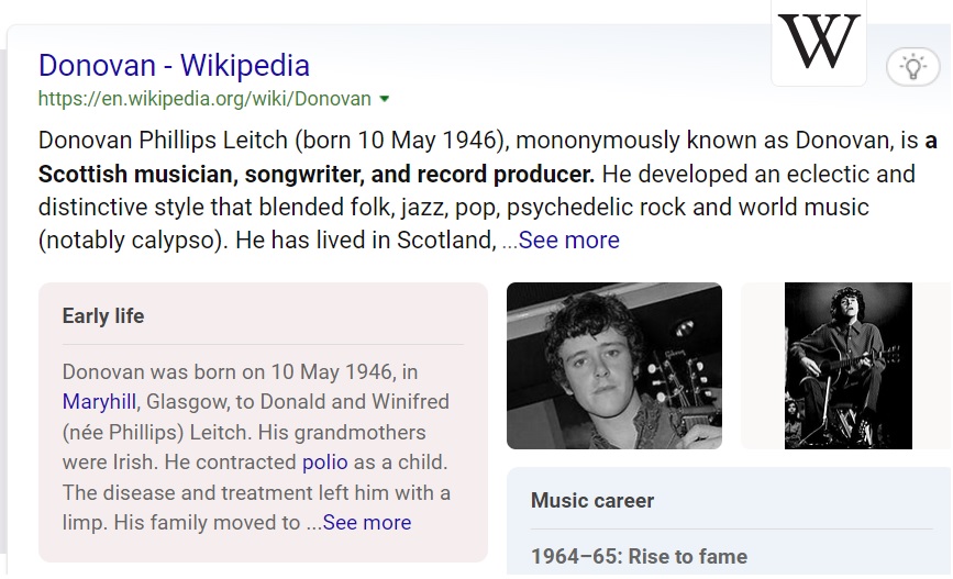 I reckon this was also a belated omen bet – I say that because when I went back and looked through Donovan’s catalogue today to listen to Atlantis again, up pops his bio, and what do you know…