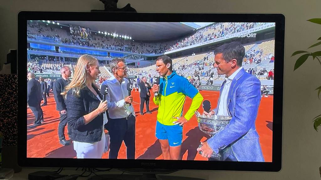 By holding La Coupe des Mousquetaires while interviewing Rafael Nadal on Eurosport: