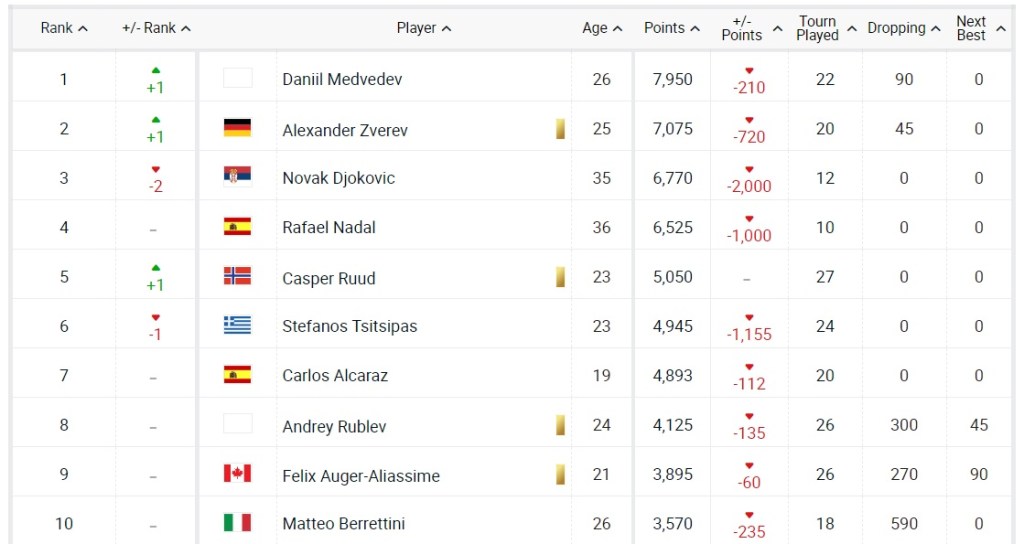 With last year’s French Open points dropped, Medvedev went back to World No.1, which he’ll comfortably hold after Wimbledon thanks to the no ranking points situation and the fact that Novak Djokovic is the defending champion (They’ll drop off on July 11 I believe), Alexander Zverev is at a career-high World No.2, although he’ll lose that at some point in the coming months due to his foot injury in the French Open semi-final, Djokovic has dropped to World No.3, his first ranking outside the Top 2 since October 2018, and Rafael Nadal is No.4 following a 13th win at Roland Garros.