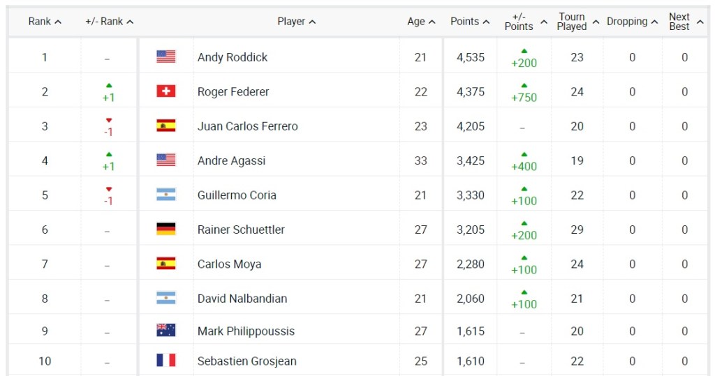 That week also saw the year-ending Tennis Masters Cup (Now the ATP Tour Finals) in Houston, which Federer won fairly comfortably (Dropping just 1 set) to jump Ferrero into finishing the year as the World No.2 behind Roddick, setting the stage for Roger’s takeover of Men’s tennis in Melbourne a few months later: