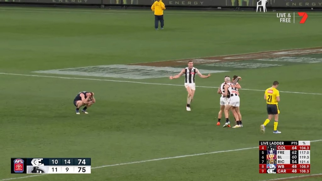 Jamie Elliott puts Collingwood up by 1 point with 2 minutes to go, dropping Carlton to 9th: