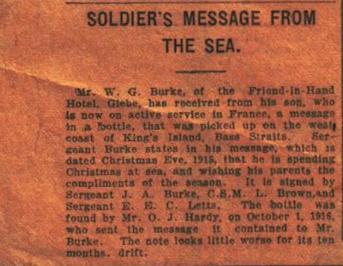 I do have one thing in mind to do while I’m there, and it involves this newspaper article from 1916, regarding my great-great grandfather sending a message in a bottle from Europe to Bass Strait during the war: