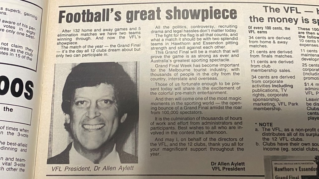 Having a flick through the 1983 Grand Final record, among the adverts for Winfield and Peter Jackson, there’s a message from then-VFL President Dr Allen Aylett, which is a coincidental case of timing, as the great Doc, who did the impossible and made North Melbourne a respectable football club, died only last week.