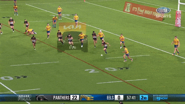The Panthers are 22-0 up after 58 minutes, the game and the Premiership pretty much done to a dinner due to suffocating the Eels’ attack, but in a bid to avoid a humiliating shutout, the Eels get creative and kick early to get a line break down the left edge, and Bailey Simonsson explodes over 40 metres past 2 Panthers defenders…