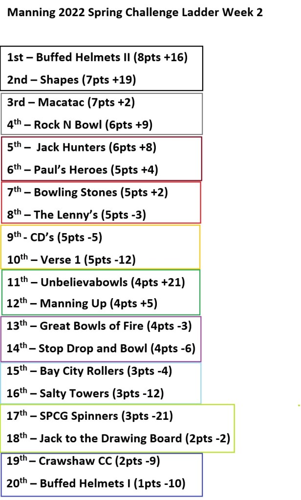 Thus, next week’s fixtures will be based on the ladder through the 2 weeks of the Spring Challenge, with every team from 1st down to 20th playing the corresponding team on the ladder (Thankfully there’s no double ups), with the highlights being the money matches between 1st vs 2nd (Buffed Helmets II vs Shapes) and 3rd vs 4th (Macatac vs Rock N Bowl), with every team from 5th down to 20th guaranteed a novelty award of some kind.