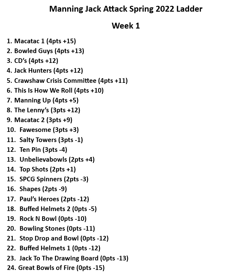 After 8 months of build-up and near-record levels of anticipation, Greatest Social Bowls Competition Between Manning Road and the Canning River is back to end 2022, and unlike this year’s Melbourne Cup, we’ve got 24 starters for this edition of Jack Attack (With a maximum of 28), and a pleasing fact is that 18 out of the 20 teams that played in the Spring Challenge are backing up in Jack Attack, with the two absences being the Bay City Rollers, who were only a floating team to make an even number, and Verse 1 were forced to withdraw during the break, thanks to injuries sustained by Mick and Peg Daly.