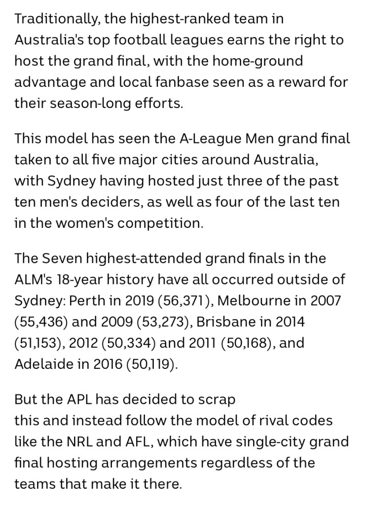 They’ve also managed to kill a tradition that helped make the A-League Grand Final a unique event… the huge home crowd advantage and the chance to see a different state/city host the Grand Final.