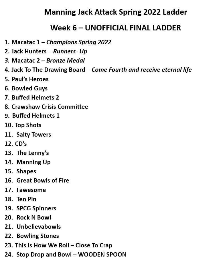 After 3 weeks of pre-season and 6 weeks of fun and frivolity, we had reached the summit of the Spring 2022 Manning Jack Attack season, bringing a close to what has been yet another ripsnorting edition of the Greatest Social Bowls Competition Between Manning Road and the Canning River, and if there’s a better Jack Attack competition in Australia, then I haven’t bothered looking at it.