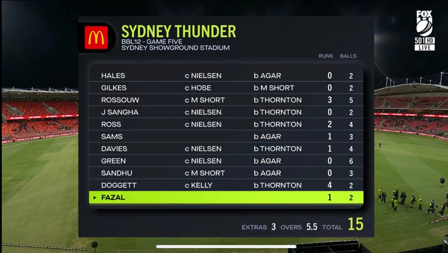 Cricket Congratulations to the Sydney Thunder for scoring 10 times as many runs as they did in their last game against Adelaide By JTithers on December 20, 2022 • ( Leave a comment ) Friday night: To tonight: Ballooned Henry Thornton’s bowling figures from 5 wickets for 3 to 3 wickets for 18. Still lost, though. Share This Post: Click to share on X (Opens in new window) X Click to share on Facebook (Opens in new window) Facebook Click to email a link to a friend (Opens in new window) Email Like Loading... Categories: Cricket Tagged as: AdelaideStrikers, Australia, BBL, BigBashLeague, Cricket, Sydney, SydneyThunder, Twenty20