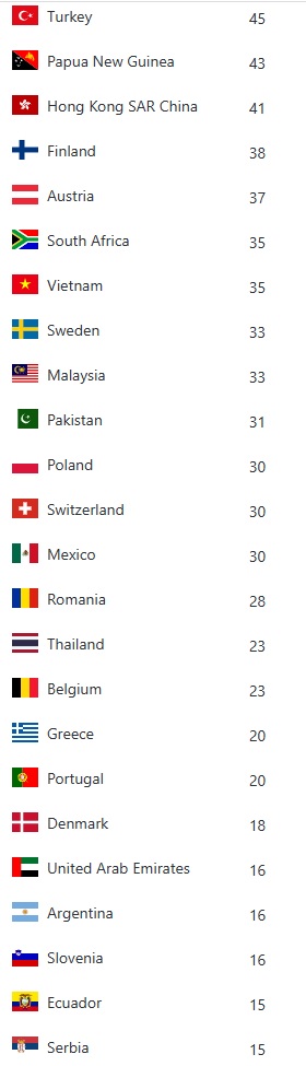 Netherlands = Jumped up from 96 to 113, although it would’ve been appropriate if they’d finished on 146, which was Max Verstappen’s winning margin in the Formula One World Championship
