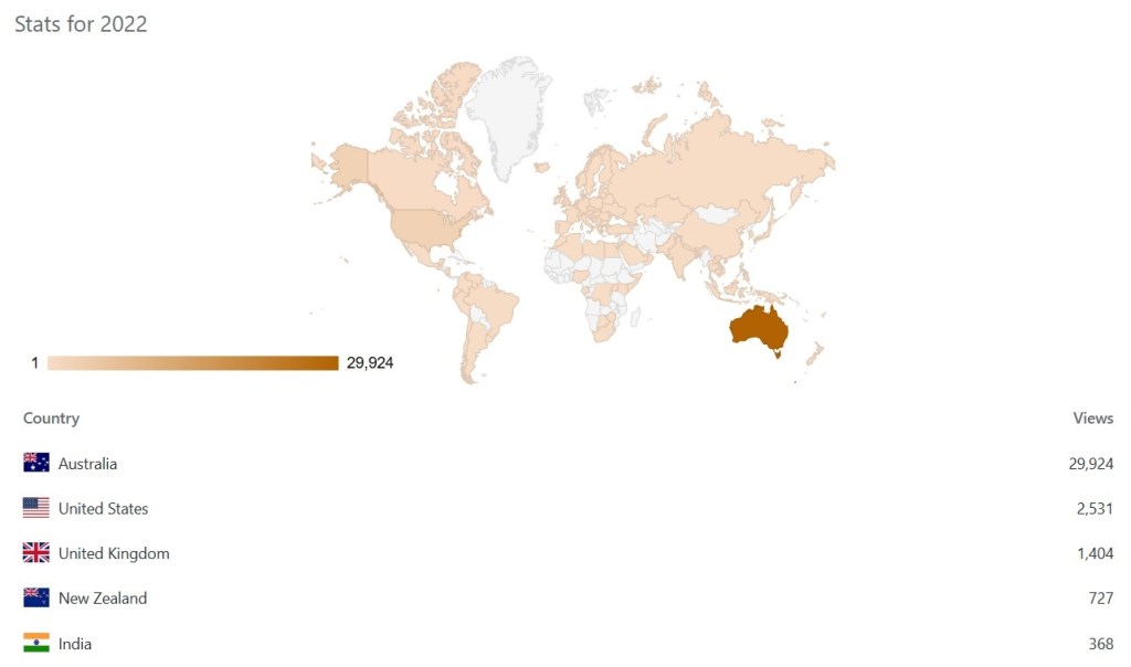 In 2022, my viewership increased by a solid 18% to 37,696 (An average of 103.27 per day), thanks in part to that post about the 30th anniversary of Geelong’s AFL record score ending up in the Top 2 results on Google and getting 7,668 clicks, and I thank you all for using my poorly constructed posts as a way to further increase your boredom.