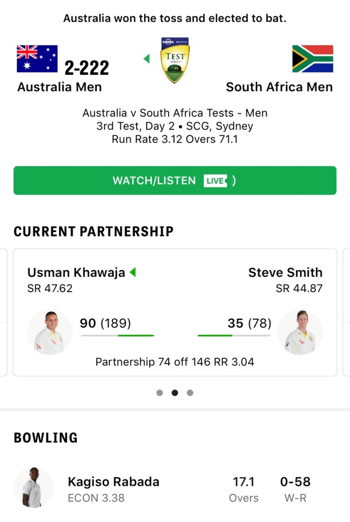 Cricket Richie Benaud would be proud By JTithers on January 5, 2023 • ( Leave a comment ) Day 2 of the Boxing Day Test, the first 2/222 of the Summer: And now Day 2 of the Sydney Test, with The Richies in attendance: 2️⃣-2️⃣2️⃣2️⃣We got it! #AUSvSA pic.twitter.com/QmoyaXHWko— cricket.com.au (@cricketcomau) January 5, 2023 Chew for Chew hundred and twenty chew, Marvellous effort that. Share This Post: Click to share on X (Opens in new window) X Click to share on Facebook (Opens in new window) Facebook Click to email a link to a friend (Opens in new window) Email Like Loading... Categories: Cricket Tagged as: 2222, Australia, Cricket, RichieBenaud, SouthAfrica, TestCricket
