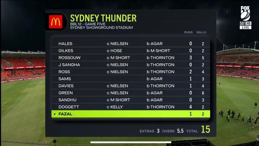 On another note, the Thunder also lost to the Sydney Sixers by 125 runs, and if you narrow it down further, Smudge scored 67 off his last 28 balls faced, more than the Thunder managed in 88 balls, and was so confident he was doing this to the Thunder attack by the end of the Sixers’ innings:
