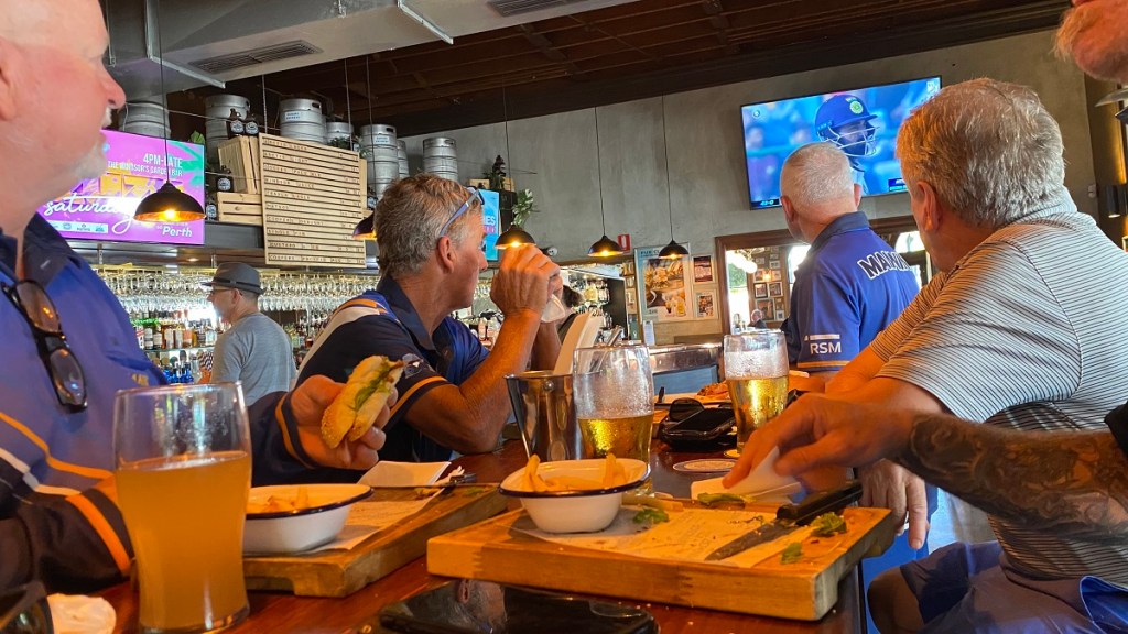 It’s probably been done hundreds of times before, but it was a solid team-building idea, I was on board, and Matty sent the SOS out on Saturday morning to the 1 Blue crew, and ultimately 9 of us out of the 16 made it to South Perth at 11 (Myself, Brett Adams, Macca & Hoskin in the one car, joined by Mark Ellis, Floppy Herbert, Jaxon of Bruce Rock, Gobby O’Brien and Heldty), and afterwards we headed out to the Windsor for lunch, and to watch Pat Cummins piss away 2 reviews against India.