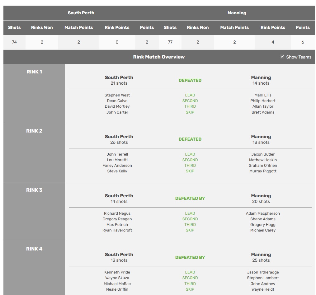 Funnily enough, Manning and South Perth played each other in Premier League at Manning on Saturday, and the result was reversed, with South Perth winning 76 to 71, 5 points to 3.
